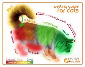 For the rest of the body, go gradually and carefully, until you know the areas where I appreciate being touched and the areas to avoid; generally, paws and belly contacts are less appreciated.