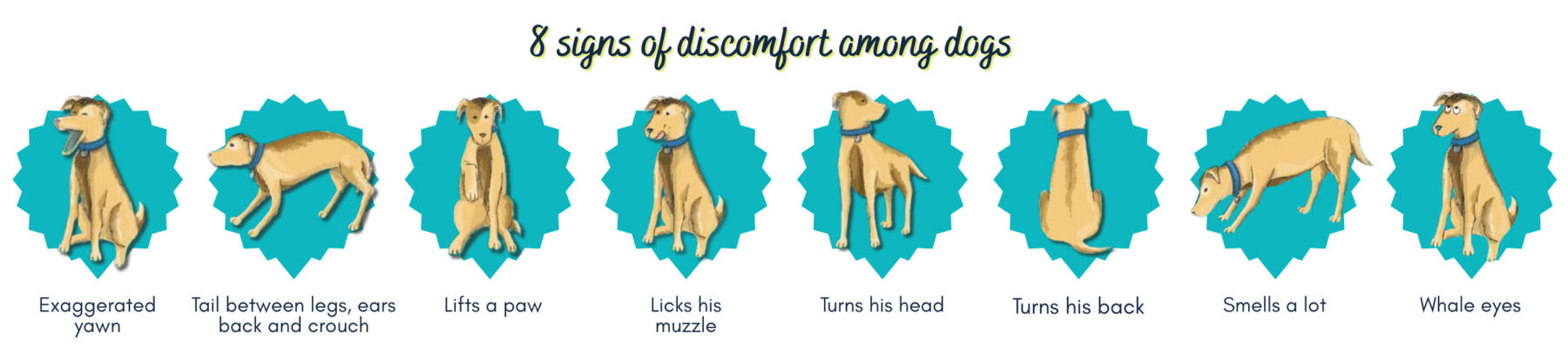 It is important to learn how to decide dog signals, respect them and act safely with them. The 8 signs presented in this image demonstrate that a dog is not comfortable in the situation he is currently experiencing. It is important to respect his emotions and to give the dog time.