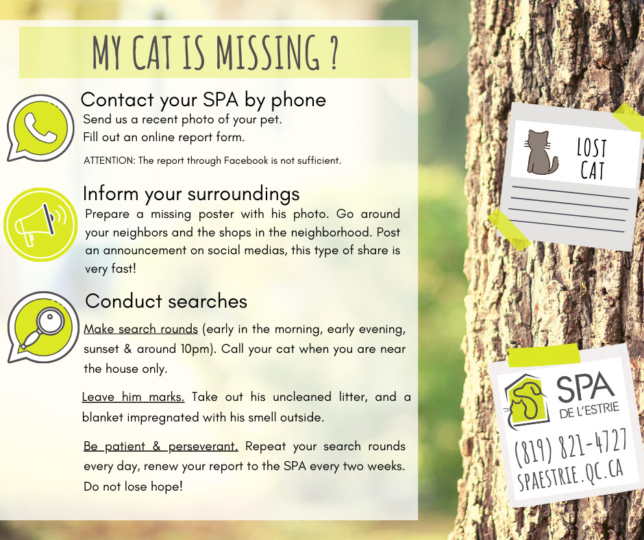 The cat that has run away often spends the first 24 hours of his fugue under a gallery, a staircase, a vehicule, or any other hiding place it will have found. As he is not limited in his movements by fences and streets, your research must therefore extend to the immediate vicinity, possibly including the sheds inside which he could have been inadvertently locked.