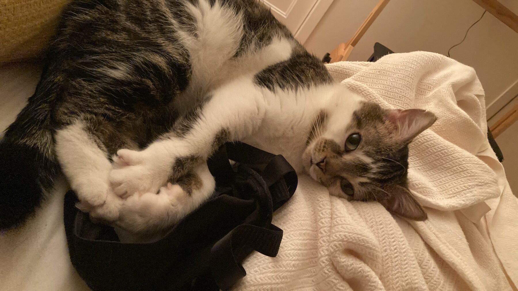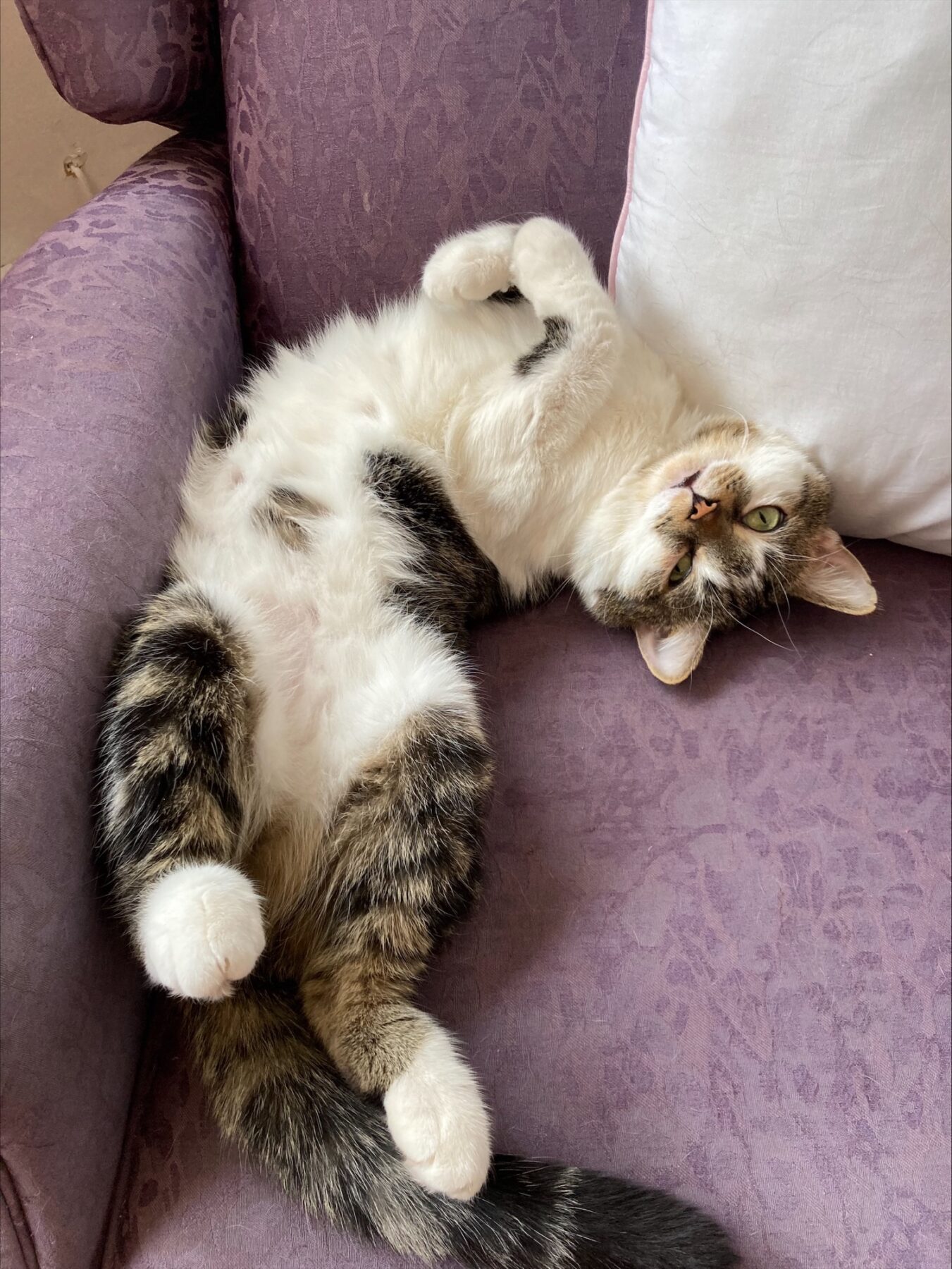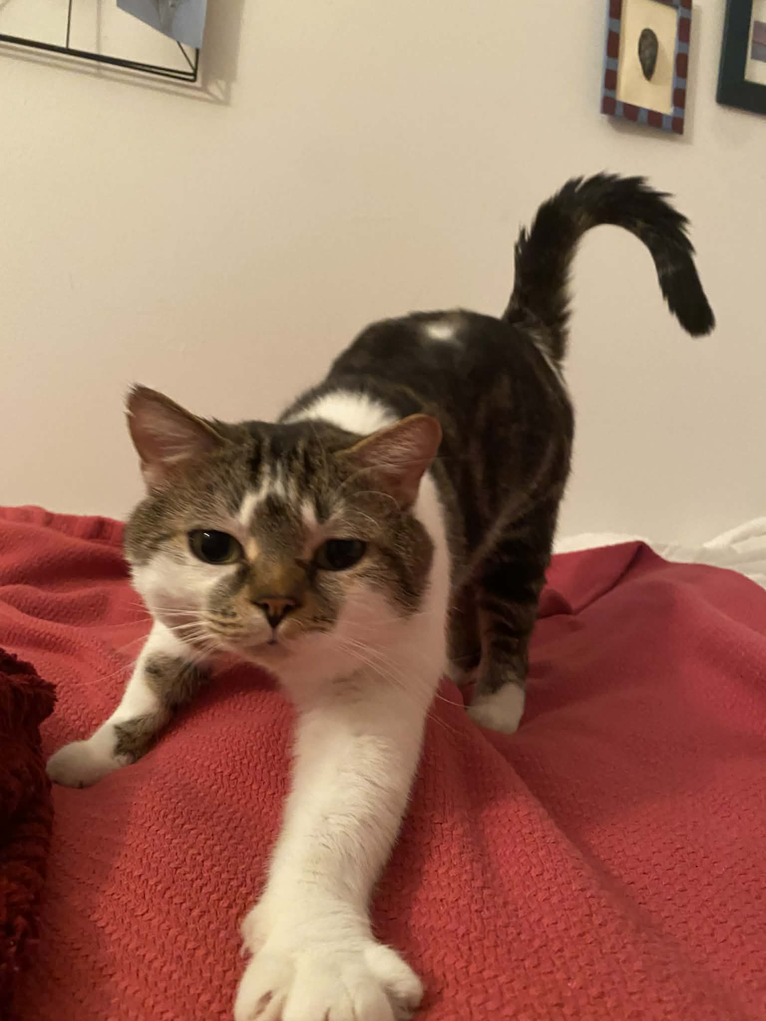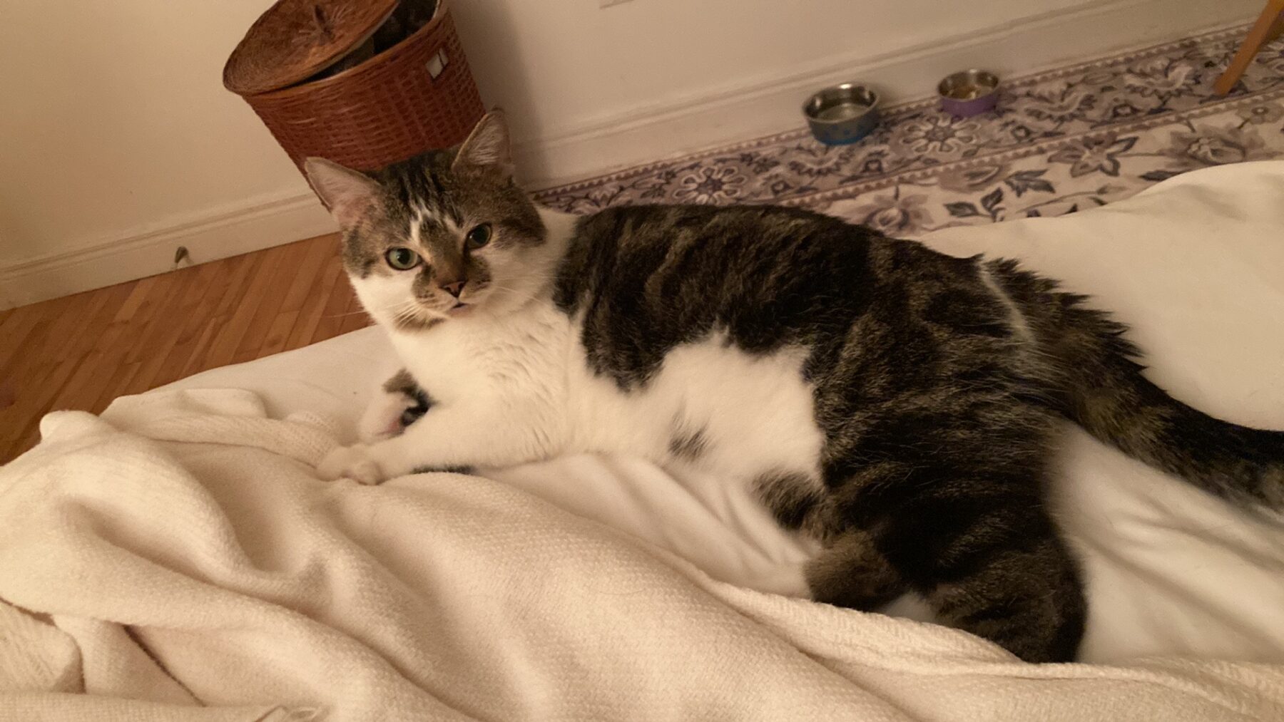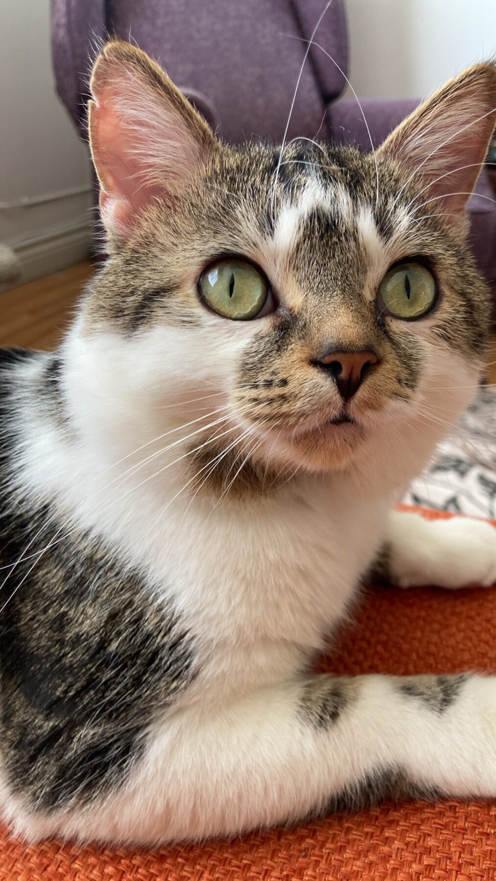 Jumbo est un chat tellement doux, affectueux et gentil! De tempérament zen et rigolo avec ses petits «miaw» tout doux quand il jase . C’est très drôle quand il a des « zoomies » puisque cela contraste avec son tempérament zen. Il aime beaucoup manger, le bol ralentisseur l’aide à manger plus tranquillement. Il aime être près de nous, et apprécie la compagnie de tous. Tous ceux qui sont venus en visite à la maison de sa famille d’accueil sont tombés amoureux.se de lui. C’est un très bon chat, super facile à vivre, il est simplement content d’être là et de recevoir de l’amour.